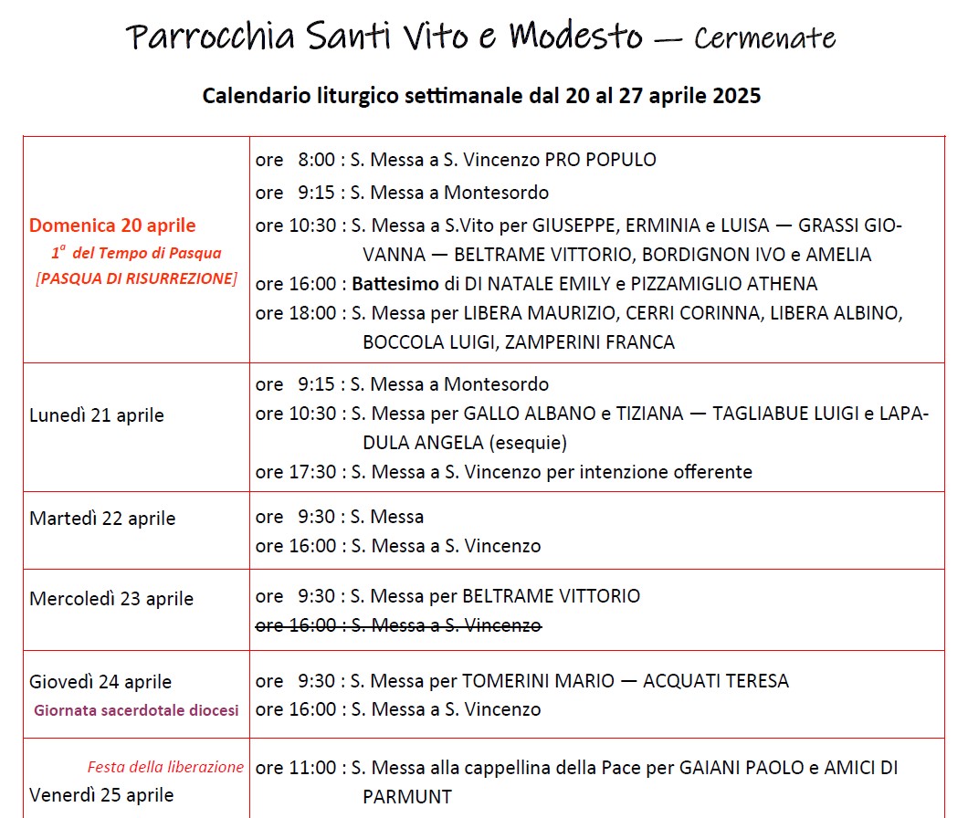 Gli orari delle celebrazioni nella settimana dal 14 al 21 dicembre 2025.