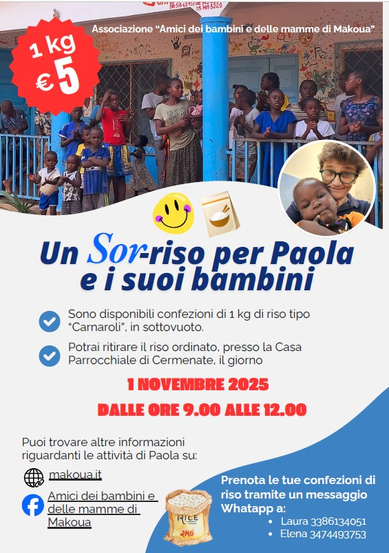 Un po’ di riso per un sorRiso dei bambini di Makoua, aiutati e sostenuti da Paola Passera. Scarica la locandina.