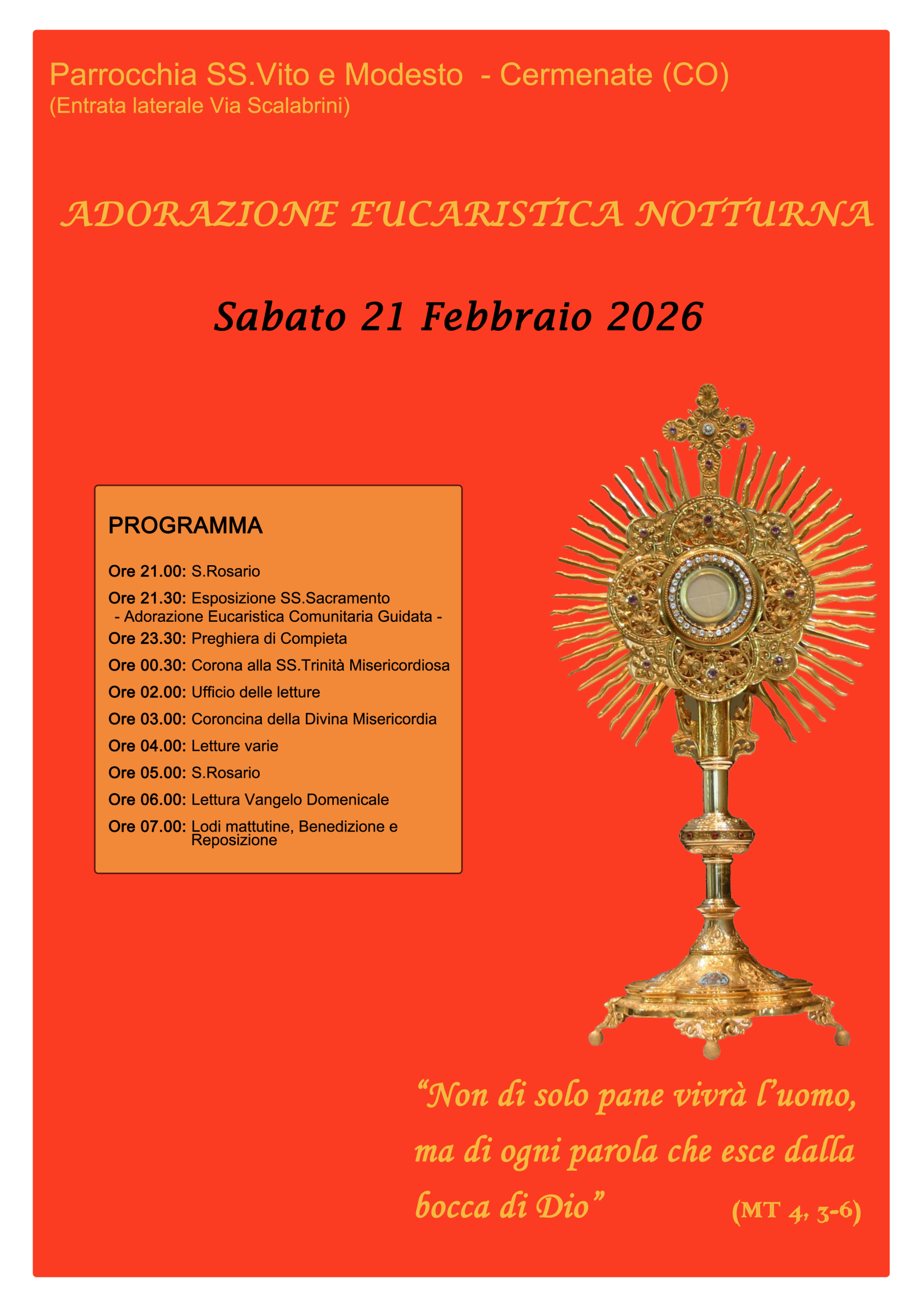 Una nuova occasione di tempo per pregare davanti al Cristo eucaristico. Puoi venire solo per pochi minuti o puoi restare a vegliare tutta la notte fino alle Lodi mattutine. La prima parte dell’adorazione sarà “comunitaria”, e poi seguirà la preghiera individuale, intervallata più o meno ad ogni ora da un momento comune. In chiesa a San Vito sabato 21 febbraio. Se vuoi scarichi la locandina come pro-memoria.