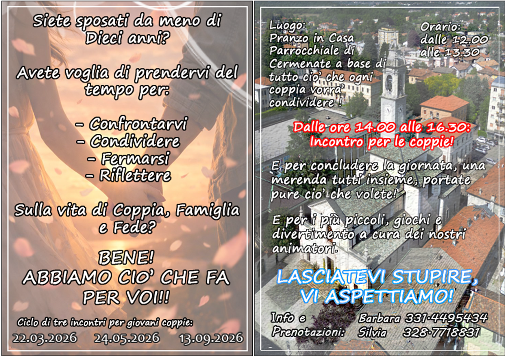 Vediamo che la vita di coppia e di famiglia non è sempre facile, soprattutto da vivere nella fede cristiana. E proprio perché non è facile, viene istintivo occuparsi delle proprie tensioni e problematicità cercando di isolarsi dal resto del mondo. Sappiamo però che la soluzione sta invece in una modalità proprio opposta, cioè nel condividere con altri quanto viviamo nella quotidianità. Il confronto in gruppo (non sempre facile e immediato), l’ascolto della parola di Dio e la preghiera aprono alla grazia divina e corroborano le relazioni smorzando le tensioni intime alla vita famigliare. Ecco perché vogliamo offrire nell’arco dell’anno alcuni momenti di incontro per coppie sposate o conviventi. Venite e vedete, come diceva Gesù a chi era incuriosito di Lui e del suo messaggio.