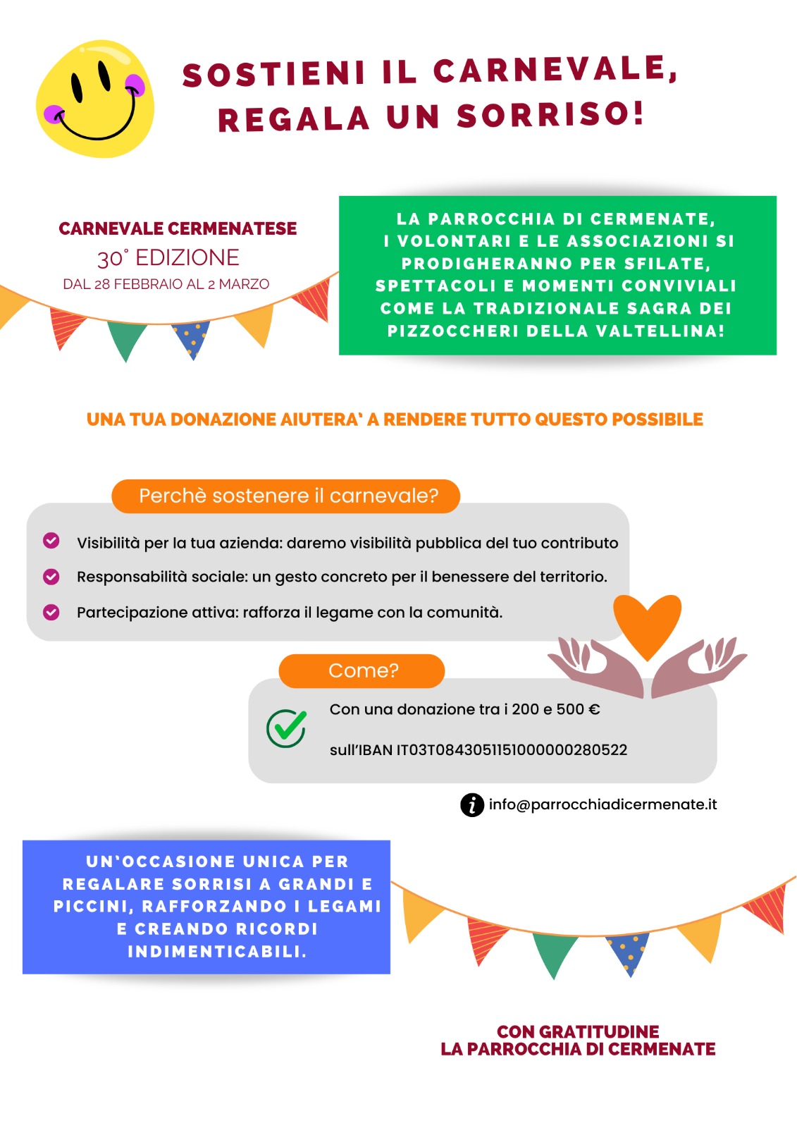 Nella locandina trovi l’IBAN parrocchiale per inviare la tua offerta. Nella causale devi scrivere: “Sponsorizzazione Carnevale Cermenatese” e il nome della tua azienda. Grazie.